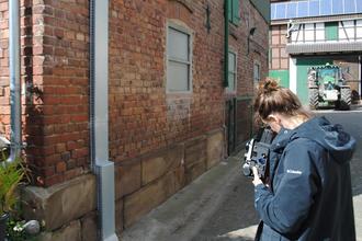 Die amerikanische Fotokünstlerin beim Fotografien einer Hochwassermarke in Wabern, die an die Bombardierung der Edertalsperre am 17. Mai 1943 erinnert (Fotografie: Thomas Schattner)