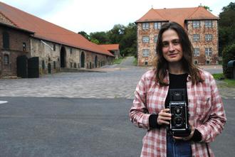 Laura Cobb mit ihrer „Mamiya C330-Kamera“ vor dem Mittelhof bei Gensungen, auf dem der spätere Widerstandskämpfer des 20. Juli 1944 seine Kindheit verbrachte (Fotografie: Thomas Schattner)