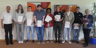 Als am 24. September 2025 die Zertifikate durch Schulleiter Herrn Wetzlaugk und Englischlehrerin Frau Opitz in der Mediothek in Fritzlar überreicht wurden, waren all die Anspannung und Anstrengung der Vorbereitung und Prüfung von den Absolventen abgefallen. Stolz und Freude über dieses erfolgreiche Ergebnis und die wertschätzenden Worte von Herrn Wetzlaugk waren jedem einzelnen von ihnen anzusehen. Besonders hervorzuheben sind die hervorragenden Ergebnisse von Elias Hommel, Justin Saraoua und Kai Wolff, die dafür mit einem Geschenkgutschein bedacht wurden.Frau Opitz freute sich über einen Blumenstrauß verbunden mit dem Dank von Herrn Wetzlaugk für ihr jahrelanges Engagement bei der Vorbereitung auf die Prüfung.