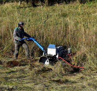 Der motorisierte Einachsmäher Brielmaier der Rapid Technic GmbH eignet sich mit seiner bodenschonenden Bereifung und seinem speziellen Aufbau besonders gut für das Mähen sehr feuchter oder steiler Flächen. © LPV Schwalm-Eder e.V.