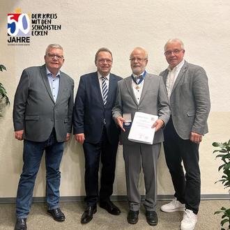 Foto: (v. li.) Reimund Schirmer (Vorsitzender der Gemeindevertretung Malsfeld), Landrat Winfried Becker, Wilfried Sommer und Malsfelds Bürgermeister Michael Hanke (Bildautorin: Gemeinde Malsfeld)