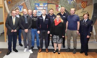 von links: Landrat Winfried Becker, Dr. Hartmut Lotz - Ärztlicher Leiter Rettungsdienst, Thomas Schröder - Leitender Notarzrt (LNA), Uwe Wunsch - stellv. Fachbereichsleiter Brand-, Katastrophenschutz u. Rettungswesen, Pascal Steil - Organisatorsicher Leiter Rettungsdienst (OLRD), Constatntin Mühr - OLRD, Marius Damm - OLRD, Kathrin Häfele - LNA, Helge Stuhlmann - OLRD, Benjamin Reitz - OLRD, Tanja Dittmar - Kreisbrandinspektorin