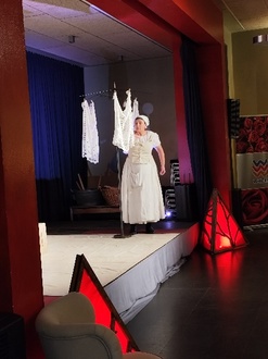 Die Einzeldarstellerin schaffte es, nur mit wenigen Requisiten und ihrer markanten Stimme gleichzeitig mehrere Personen auf der Bühne interpretieren zu können.