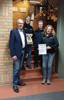 Die Urkunde, verbunden mit einem Preisgeld, sowie eine Wabern-Tasche mit Süßigkeiten konnten Karin Schneider und Manuela Botte, Kinderfeuerwehr Harle sowie Tanja Bodenhorn, stellv. Wehrführerin FFW Harle von Bürgermeister Claus Steinmetz überreicht werden.