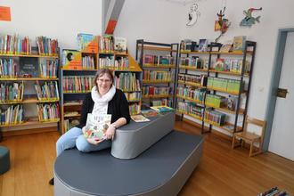 Die Leiterin der Stadtbücherei Borken, Veronika Bruckner, freut sich über die neuen Sitzmöbel. Quelle: Stadt Borken