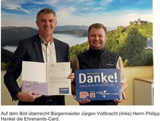 Im Rathaus in Sachsenhausen wurde Philipp Hankel aus Waldeck mit der Ehrenamts-Card ausgezeichnet. Bürgermeister Jürgen Vollbracht überreichte die Karte im Auftrag des Landkreises als kleines Dankeschön für dessen langjährigen ehrenamtlichen Tätigkeiten für seinen Heimatort und darüber hinaus auch für überregionale Verbände.