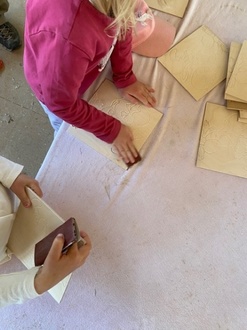 mit der man nach Vorlage etwas in die Oberfläche fräsen kann. Dieser Maschine durften wir auch beim Arbeiten zusehen. Am allerspannendsten bei der Maschine ist, dass davor eine Gummimatte liegt. Und wenn die Maschine arbeitet und ein Fuß auf die Matte tritt, hört die Maschine zur Sicherheit auf zu fräsen. Es gab tatsächlich keine Unterbrechung. Alle Kinderfüße blieben von der Matte weg. Gespannt sahen die Kinder zu, was aus der Fräse für ein Motiv kam. Passend zur Jahreszeit, ein Osterhase. Aber nur schauen war auf die Dauer zu langweilig. Es ging an die Arbeit. Für alle Kinder gab es ein Osterhasenbild. Allerdings noch mit Spänen versehen. Mit Schleifpapier bearbeiteten die Kinder ihre Hasen und zeichneten mit einem Bleistift die Konturen nach. Wer mochte, konnte dann im Kindergarten das Bild noch mit Farbe bunt anmalen.