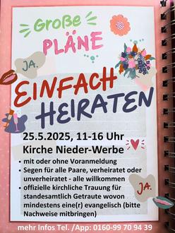 Nieder-Werbe: Die nächsten Termine sind: 11.05. und 25.05. jeweils um 10:00 Uhr. An Christi Himmelfahrt (29.05.2025) um 9:30 Uhr in Ober-Werbe, am 08.06. (Pfingsten) um 13:00 Uhr und am 22.06. um 10:00 Uhr.