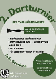 Der TV 08 Höringhausen lädt herzlich zu einem unterhaltsamen Dartabend ein. Freut euch auf spannende Spiele und einen sportlichen Wettbewerb mit tollen Gewinnen.