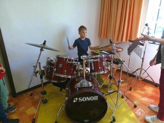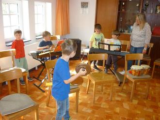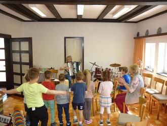 Nun durften unsere Körper die Instrumente sein als wir zum Rhythmus von „We will rock you“ die „Ode an den Kindergarten“ sangen. Mit den Boomwhackers (verschieden dicke und lange Kunststoffröhren) begleiteten wir das „Ameisenlied“. Nun waren die Orff-Instrumente dran, die uns mit einem schwungvollen Cha-Cha-Cha in den Dschungel entführten. Mit dem Affenschaukel-Lied testeten wir die Lautstärken der verschiedenen Instrumente, bevor sie mit dem Frosch-Konzert weggeräumt wurden. Nun folgte das Highlight des Tages, die Kinder durften ans Schlagzeug, lautstark wurden die Becken und Pauken bespielt. Das Akkordeon stellte uns vor große Aufgaben, denn spielen und gleichzeitig den Balg aufziehen, ist gar nicht so einfach.