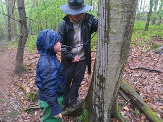 Bei leichtem Nieselregen gingen wir Tigerenten aus dem Kindergarten Panama am 24.04.25 gemeinsam mit Rangerin Renee und Wildkatze Felix los, um zu erfahren, was in der Frühlingszeit im Nationalpark passiert. In einer Traumreise verwandelten wir uns in Bucheckern, die in der Erde schlummern, Wurzeln und Blätter bekommen und als junge Buchen im Frühling eifrig Richtung Himmel wachsen. Auf unserem weiteren Weg fanden wir Eicheln, die im letzten Herbst heruntergefallen und mit aufgeplatzter Schale auf dem Waldboden lagen. Auch bei ihnen lugte ein zarter Keimling heraus – der mal zu einer mächtigen Eiche werden möchte. Am Waldsofa stärkten wir uns erstmal mit unserem Waldfrühstück. Mit einem Stethoskop konnten wir am Stamm einer jungen Buche hören, wie sie das Wasser über ihre Wurzeln, den Stamm hoch, bis in die Äste, Zweige und in die Blätter zieht.