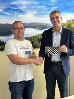Auf dem Bild gratuliert Bürgermeister Jürgen Vollbracht (rechts) Herrn Benjamin Graß zur Ehrenamts-Card