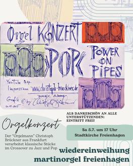 Samstag 5.7. um 17 Uhr, Stadtkirche Freienhagen, Eintritt frei! Wiedereinweihung der sanierten Orgel mit dem „Orgelmann“ Christoph Brückner aus Frankfurt – Crossover aus klassischer Musik, Jazz und Pop. Alle herzlich willkommen!
