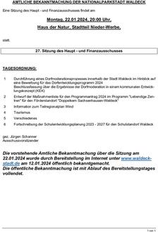 Die vorstehende Amtliche Bekanntmachung über die Sitzung am 22.01.2024 wurde durch Bereitstellung im Internet unter www.waldeckstadt.de am 12.01.2024 öffentlich bekanntgemacht. Die öffentliche Bekanntmachung ist mit Ablauf des Bereitstellungstages vollendet.