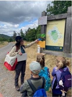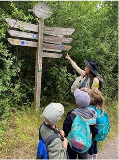 Der Rangerausflug begann weiterhin damit, den Kindern ein besonderes Schild zu erklären. Das Schild ist gelb mit einer Eule drauf. Den Kindern wurde erklärt, dass so ein Schild den Beginn eines Nationalparks kennzeichnet. Weiterhin hat Alisa den Kindern „Pflöcke“ gezeigt. Diese sind mit vielen Namen und Pfeilen bestückt, die in viele Richtungen zeigen. Dazu stehen auch verschiedene Zahlen auf den „Pflöcken“. Alisa hat den Vorschulkindern erklärt, dass diese sehr wichtig wären, falls mal ein Unfall passiert ist. Dann kann man diese Nummern am „Pflock“ am Telefon durchgeben und somit wird dein Standort von einer Zentrale gesucht und hilft dabei, z.B. einen verletzten Menschen schneller wiederzufinden.