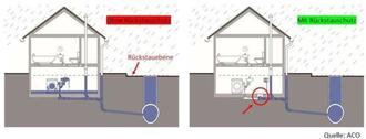 Welche Lösung jeweils sinnvoll ist, hängt von den individuellen Gegebenheiten vor Ort ab. Es sollte die Hilfe eines Fachbetriebes in Anspruch genommen werden, der vor Ort berät und einen individuellen Lösungsvorschlag erarbeitet. Hierbei unterstützen die Handwerksbetriebe für Heizung, Lüftung und Sanitär, welche die Anlagen auch einbauen können. Zusätzlich sollte jeder Hauseigentümer prüfen, ob Oberflächenwasser bei Starkregenereignissen auch über Lichtschächte oder Kelleraußentreppen in die Kellerräume gelangen kann. Sollte Handlungsbedarf bestehen, sollten die Lichtschächte und Treppenbrüstungen erhöht werden. Die Wirkung einer Rückstausicherung ist aus dem Schaubild zu ersehen.