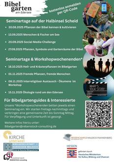 Zum Auftakt der Seminarreihe im Bibelgarten erwartet Sie ein bunter Tag mit Wissenswerten rund um den Bibelgarten am Edersee, Geschichten und Stationen in der Anlage und viel Information rund um die mediterrane Pflanzenwelt. Heiko Moog vom Botanischen Garten der Phillipsuniversität Marburg stellt Feige, Olive, Granatapfel, Mandel, schwarze Maulbeere und Zitrone näher vor und gibt Tipps zu deren Kultivierung in unseren Gärten und Balkonen. Die Seminare der Reihe können über das Buchungsportal der Evangelischen Kirche Kurhessen Waldeck gebucht werden und sind Dank einer Förderung des Hessischen Kultusministeriums für Sie kostenfrei. Mehr Informationen erhalten Sie im Buchungsportal (QR-Code scannen) oder per Mail an: Bibelgarten@rebenstock-consulting.de