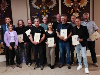 Das Bild zeigt die Geehrten mit Bürgermeister Jürgen Vollbracht und Stadtverordnetenvorsteherin Anni Maria Berthold von links nach rechts: Thomas Schreiber, Michael Anhalt, Bert Wagener, Helmut Koch, Anika Wagener, Michael Merhof, Arno Dombrowski, Arndt Fingerhut, Jens Schumann und Andreas Malcher Es fehlten: Torben Habicht, Jens Paul und Desiree