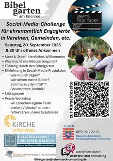 Am Samstag, den 20. September 2025, lädt die Kirche unterwegs in den Bibelgarten am Edersee ein. Engagierte Ehrenamtliche aus Vereinen und Gemeinden lernen ganz praktisch im Rahmen einer Social-Media-Challenge ihr Engagement transparenter zu machen und für Vereins- bzw. Gemeindeziele zu werben.