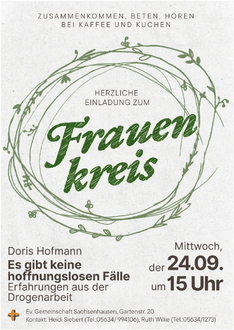 | 15.00 Uhr | Frauenkreis mit Doris Hofmann |