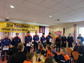 Es ist auch erfreulich, dass wir Leni Baureis, Luke Henry Oswald, Isabell Niemann, Maja Simshäuser, Aurelia Schlidt, Emma Lynn Schlömp und Mica Siepmann von der Kinderfeuerwehr obligatorisch in die Jugendfeuerwehr übernehmen konnten.