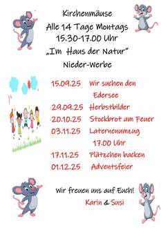 Die Kirchenmäuse treffen sich 14-tägig montags von 15.30 Uhr bis 17.00 Uhr „im Haus der Natur“ in Nieder-Werbe. Das nächste Treffen ist 20.10. Das Thema lautet: Stockbrot am Feuer