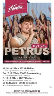 Am Freitag, 18.10.2024, findet um 19.30 Uhr in der Stadthalle Korbach das Adonia-Musical über die Geschichte von Petrus statt.