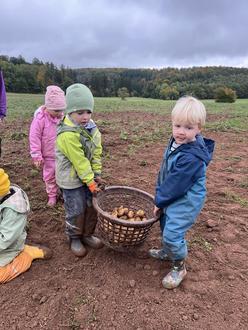 Auch in diesem Jahr folgte der Kindergarten Freienhagen wieder gern der Einladung der Familie Emmeluth, um beim traditionellen Kartoffelausmachen zu helfen. Mit viel Freude und Eifer machten sich die Kinder ans Werk- und dank ihrer tatkräftigen Unterstützung war die Arbeit schneller erledigt als geplant. Kurzentschlossen ging es dann in den Wald, um die dort entspringende Elbquelle anzusehen. Der Weg dorthin erwies sich als echtes Abenteuer, denn offenbar war schon länger niemand mehr dort unterwegs. So mussten sich die Kinder ihren Pfad durch hohen Farn selber bahnen- ein spannendes Erlebnis für alle! Währenddessen durften die jüngsten Kinder den Kindergarten ganz für sich allein beanspruchen und einen ruhigen Vormittag mit Spielen und Entdecken verbringen.