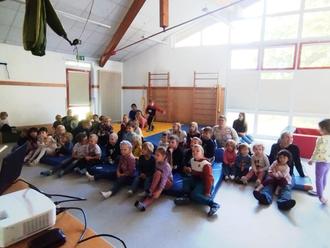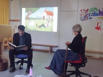 Dieses Mal brachte sie noch jemand anderen mit, der auch gerne Märchen liest und es sich nicht entgehen lassen wollte, den Waldeckern Kindern auch ein Märchen vorzulesen. Es war unser Bürgermeister Nicolas Havel. Er las ein Märchen vor von einem Tisch… einem Esel… und einem Knüppel.