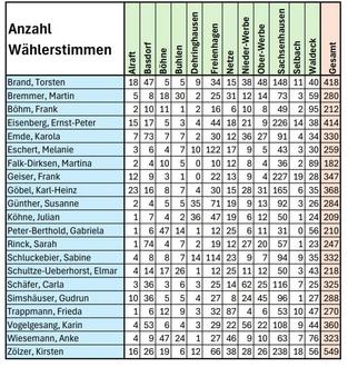 Die 14 Kandidat*innen mit den meisten Stimmen werden gewählte Mitglieder des neuen Kirchenvorstands (in alphabetischer Reihenfolge): Torsten Brand, Martin Bremmer, Ernst-Peter Eisenberg, Karola Emde, Frank Geiser, Karl-Heinz Göbel, Susanne Günther, Carla Schäfer, Sabine Schluckebier, Gudrun Simshäuser, Frieda Trappmann, Karin Vogelgesang, Anke Wiesemann, Kirsten Zölzer. Herzlichen Glückwunsch!