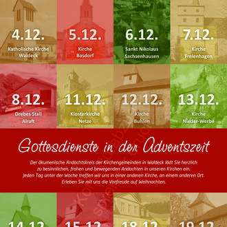 Ab Montag, den 04.12. bis zum 22.12., ökumenische Adventsandachten von Montag bis Freitag täglich um 18.00 Uhr in allen Orten der Evangelischen Kirchengemeinde Waldeck. Die Adventsandachten finden in Zusammenarbeit der Katholischen Kirchengemeinde, der Evangelischen Gemeinschaft und der Evangelischen Kirchengemeinde statt.