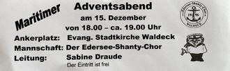 Der Edersee-Shanty-Chor aus Waldeck lädt zu einem Maritimen Adventsabend am Freitag, den 15.12. um 18.00 Uhr in die Ev. Stadtkirche Waldeck ein. Der Eintritt ist frei!