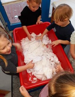 Das mussten wir doch einmal ausprobieren! Wir holten eine große Wanne, packten sie mit Schnee voll und trugen sie in unsere Gruppe. Wenn man dort mit den Händen reingefasst hat, war das wirklich ganz schön kalt! Wir haben dann aus dem Schnee zwei Kugeln geformt und diese in zwei Schüsseln gelegt. Die eine Schüssel wanderte in das Gefrierfach des Kühlschranks und die andere stellten wir in unseren Gruppenraum. Jetzt mussten wir das Ganze nur noch beobachten und schauen, was passiert. Spannend! Die Kugel im Gefrierfach wurde sehr hart und noch kälter. Die andere im Gruppenraum war genau nach einer Stunde, drei Minuten und sechs Sekunden Wasser, der Schnee war getaut! Aber das bedeutet ja, dass Schnee aus Wasser besteht und wenn es noch kälter wird, dann wird das Wasser zu Eis! Wirklich verblüffend!