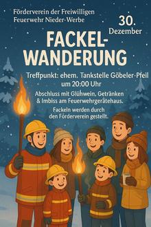 Wir treffen uns um 20:00 Uhr an der ehemaligen Tankstelle Pfeil (Uferstraße 13) und werden mit Fackeln eine kleine Runde durch den Ort spazieren. Die Fackeln werden vom Förderverein gestellt. Der Abschluss wird dann mit Glühwein, kalten Getränken und einem kleinen Imbiss am und im Feuerwehrgerätehaus stattfinden!