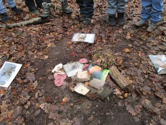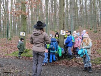 Bei unserer Wanderung am Wildpark entlang wurden wir zu Dedektiven, die die Spuren des Waldes entdeckten: Baumrinde, Früchte, Moos und Pilze, Fußabdrücke, Fell, Geweih, Knochen von Wildtieren… Wer wusste vorher, dass der Specht mit Kiefernzapfen seine Vorratshöhle verschließt und dass man das „Spechtnagel“ nennt?