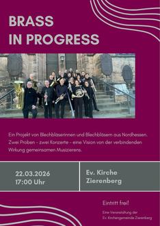 17 Uhr „Brass in Progress – Blechbläser aus der Region“ Eine lockere wechselnde Blechbläserbesetzung, aus dem überwiegend gebürtigen Großraum Nordhessen, gastiert mit einem abwechslungsreichen Programm unterschiedlicher Genres in der Evangelischen Stadtkirche Zierenberg.