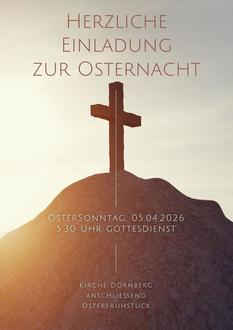 Am Sonntag, 5. April, um 5.30 Uhr wird vor und in der Kirche Dörnberg die Osternacht gefeiert. Im Dunkel wird gemeinsam das Licht des Ostermorgens begrüßt. Im Anschluss sind alle herzlich zum Osterfrühstück eingeladen.