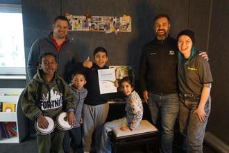 Auszeichnung und Preisgeld für junges Musikmachen: Die Stiftungsbotschafter Steffen Kleinschmidt (links) und Florian Baistock (Mitte) von der Wunschimmobilie Massivbau e.K. übergaben die Urkunde der Town & Country Stiftung an Projektleiterin Hannah Greve vom Sternenhaus und die musikbegeisterten Kinder.