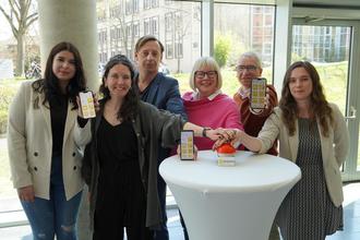 Sie drücken symbolisch auf den Startknopf für die Integreat-App im Landkreis Kassel: (v.l.) Ana Catarina Cunha de Castro (WIR-Vielfaltszentrum), Laura Reichert (Tür an Tür GmbH), Sebastian Hillberger (WIR-Vielfaltszentrum), Erste Kreisbeigeordnete Silke Engler, Andreas Bernhard (Wir-Vielfaltszentrum) und Elena Becker (Fachdienst Flüchtlingshilfe).