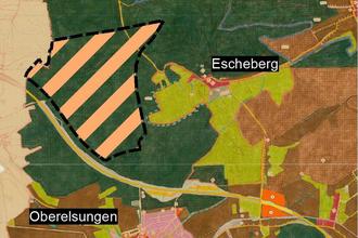 Die als Windenergiegebiet dargestellten Flächen (orange schraffierte Fläche) befinden sich westlich der Ortslage Escheberg und nördlich der Ortslage Oberelsungen. Die Flächen sind Teil der nordwestlichen Grenzmarkierung des Stadtgebiets Zierenberg und grenzen unmittelbar an die Gemarkung der Gemeinde Breuna an. Die verfahrensgegenständlichen Flächen übernehmen und arrondieren die bestehenden regionalplanerischen Vorranggebiete für Windenergienutzung „Am Escheberg" (Kennung KS 31/33) und „Hegeholz" (Kennung KS 34) bis zur südlich querenden Bundesautobahn A44.