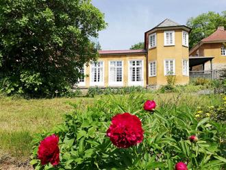 Vor der schmucken Kulisse der Orangerie des Gutes Escheberg und unter frühlingshaft grünen Bäumen des Landschaftsparks nimmt Eva Karner die Teilnehmenden mit auf eine Gedankenreise in das ausgehende 19. Jahrhundert und die Welt der britischen Schriftstellerin Elizabeth von Arnim.