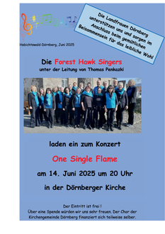 Die Forest Hawk Singers unter der Leitung von Thomas Penkazki laden ein zum Konzert „One Single Flame“ am 14. Juni, um 20 Uhr, in der Dörnberger Kirche.