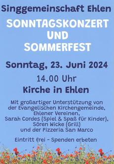 Zu einem unterhaltsamen Sonntagskonzert lädt die Singgemeinschaft Ehlen in Kooperation mit der evangelischen Kirchengemeinde am Sonntag, 23. Juni, um 14 Uhr, in die evangelische Kirche nach Ehlen ein. Anschließend sind die Konzertbesucher herzlich zu einem gemeinsamen Sommerfest rund um die Kirche eingeladen.