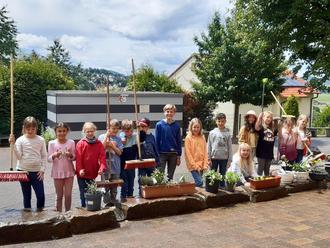 Kinder der Natur-AG mit den umgetopften Pflanzen