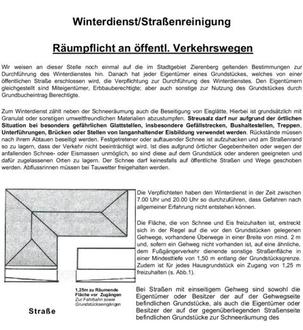 Wir weisen an dieser Stelle noch einmal auf die im Stadtgebiet Zierenberg geltenden Bestimmungen zur Durchführung des Winterdienstes hin. Danach hat jeder Eigentümer eines Grundstückes, welches von einer öffentlichen Straße erschlossen wird, die Verpflichtung zur Durchführung des Winterdienstes. Den Eigentümern gleichgestellt sind Miteigentümer, Erbbauberechtigte; aber auch sonstige zur Nutzung des Grundstückes durch Grundbucheintrag Berechtigte.