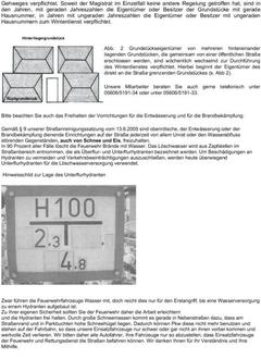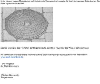 Gemäß § 9 unserer Straßenreinigungssatzung vom 13.6.2005 sind oberirdische, der Entwässerung oder der Brandbekämpfung dienende Einrichtungen auf der Straße jederzeit von allem Unrat oder den Wasserabfluss störenden Gegenständen, auch von Schnee und Eis, freizuhalten.
