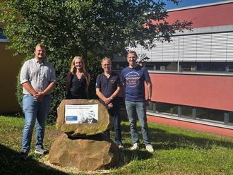 Auf dem Foto von links: Carlos Becker (SV), Emma Schunck (SV), Peter Riedler (DW) und Florian Pohlmann (stellvertretender Schulleiter).