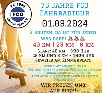 Zur besseren Planung der Touren und anschließenden Verköstigung auf dem Sportplatz freuen sich die Organisatoren über eine unverbindliche Anmeldung mit Angabe von Personenzahl und angestrebter Route per Mitteilung an: kontakt.fcoberelsungen@outlook.com. Alternativ gerne per WhatsApp an 017672651781 (Florian Grebe).