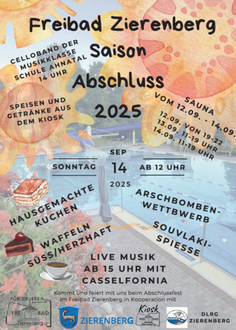 Die Badesaison ist nun fast schon wieder leider vorbei. Daher möchte der Förderverein Freibad Zierenberg noch einmal ganz herzlich einladen, um den letzten Tag mit allen Gästen noch einmal zu feiern. Für musikalische Unterhaltung sorgt ab 15 Uhr die Band Casselfornia, die mit ihrer Musik ordentlich einheizen werden. Zusätzlich wird eine Celloband aus Vellmar ihr Können ab 14 Uhr unter Beweis stellen.