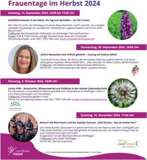 Landkreis Kassel. Ob Wanderung, Lesung, Konzert oder Infoabend: Die anstehenden Frauentage im Herbst bieten auch dieses Jahr ein facettenreiches Programm unter der Federführung von Anette Milas, Frauenbeauftragte des Landkreises Kassel.